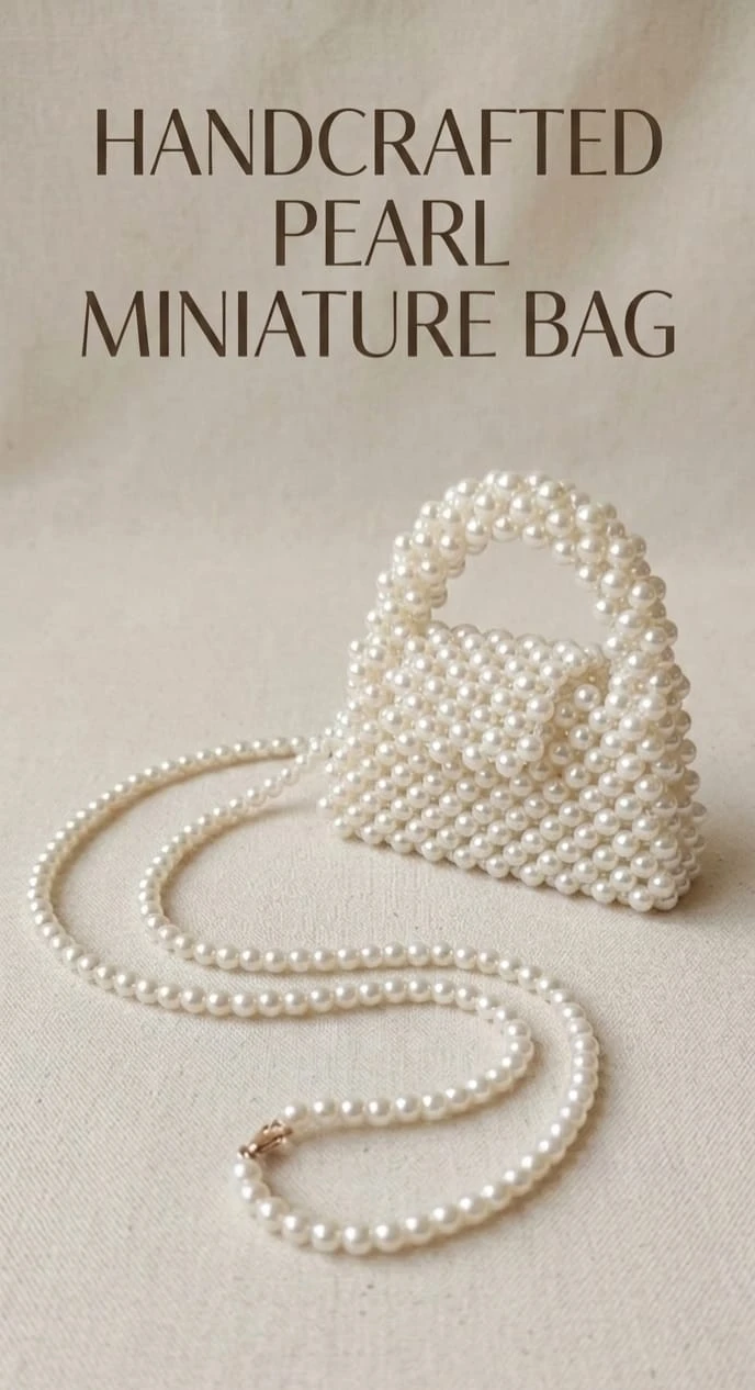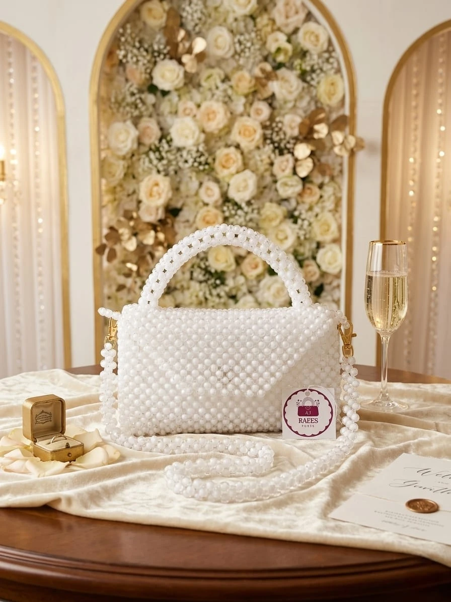 Indulge in the epitome of sophistication with the Aubergine Paris Pearl Collection. This exquisite handbag is meticulously handcrafted using lustrous, high-quality faux pearls, arranged in a structured flap silhouette.