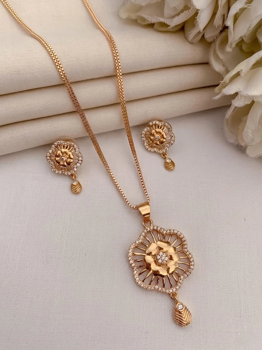 Enhance your elegance with this beautifully crafted A.D. Diamond imitation gold pendant set. Designed with a graceful floral motif and intricate detailing, this set includes a stunning pendant paired with a sleek chain and matching earrings. The combination of high-quality gold plating and sparkling American diamonds adds a luxurious touch, making it perfect for festive occasions, weddings, and daily wear. Lightweight and skin-friendly, this set blends traditional charm with modern sophistication.